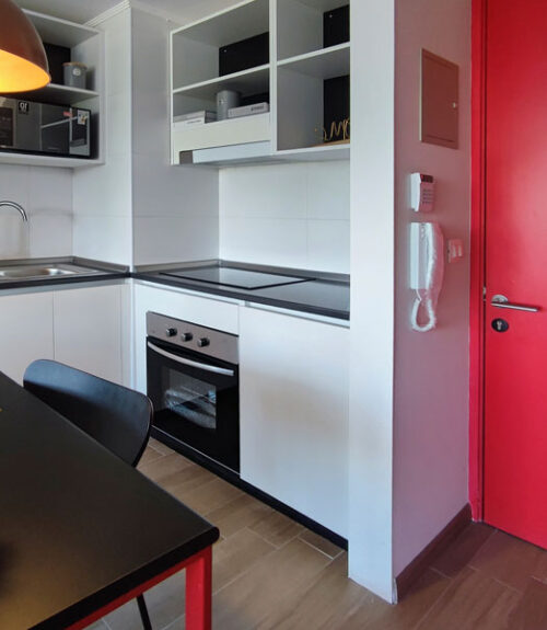 - Cocina con encimera, horno eléctrico y campana.